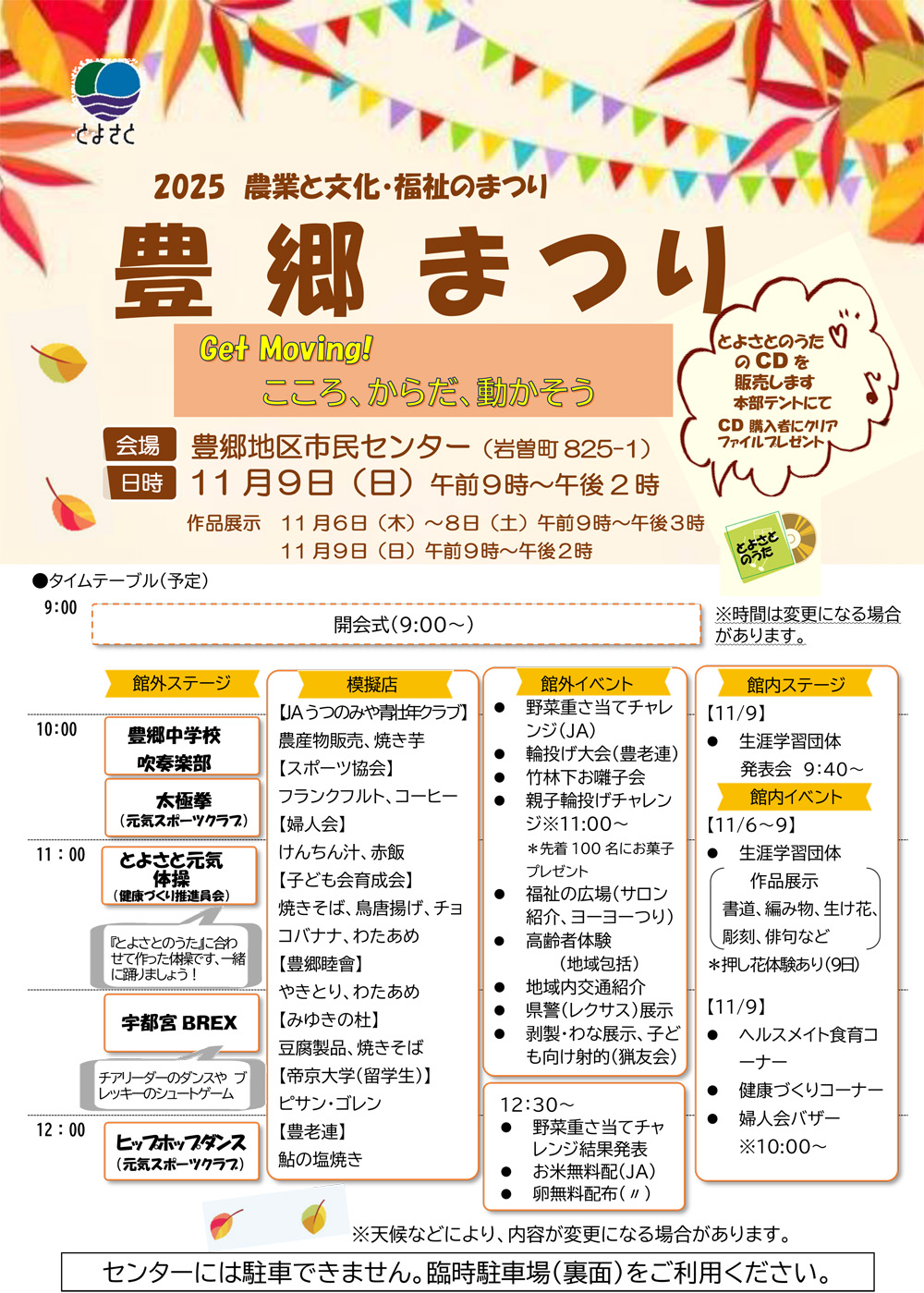 今年度の「豊郷まつり」は、11月9日(日曜日)、豊郷地区市民センター駐車場を会場に各種イベントや模擬店などが開催されます。